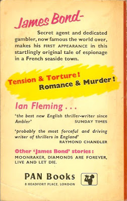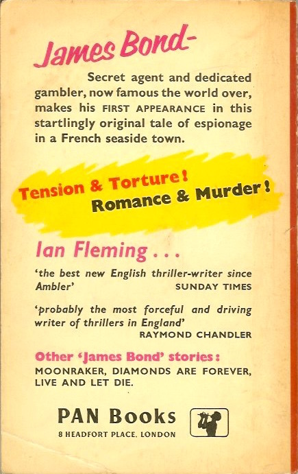 This is a 4th paperback edition of Casino Royale by Ian Fleming published by Great Pan in 1959. Love the cover art by Peff and the copy on the back. I also like that the grey matches the UK hardcover.